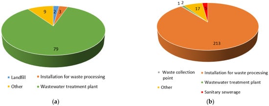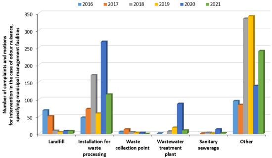 In the applications reported in the years under review, from the group of municipal management facilities, landfills, waste treatment facilities, waste collection points, wastewater treatment plants and sewer systems were indicated as odour nuisance facilities. The largest number of complaints were related to waste treatment facilities (729 out of 2284 motions). However, landfills and wastewater treatment plants were also frequently indicated, with the number of applications indicating these facilities, respectively, being 149 and 123 out of the 2284 motions (Figure 6). Attention should also be paid to the “other” group included in Figure 6, especially since 1233 odour nuisance complaints are included in it. The data provided by the environmental institution did not indicate whether these complaints relate directly to the wastewater and waste industry. Research studies have already indicated that the system of recording odour nuisance complaints in Poland requires determining the level of detail of the data collected []. A solution to this issue could be the development of a standard odour nuisance complaint card, in which the source (even a potential one) of malodorous emissions would have to be indicated during the report.