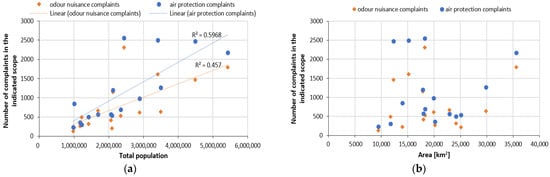 An examination of the relationship between the number of complaints in a specific range and the total population in a given area (voivodeship territory) shows that an approx. 46% change in the number of residents explains the variation in the number of odour nuisance complaints, and an approx. 60% change in the number of residents explains the variation in the number of air protection applications (Figure 8a). Relating the number of complaints to the area of each voivodeship, there was no relationship between these variables (Figure 8b). The voivodeship with the highest number of odour nuisance complaints (Łódź) ranks only 9th (out of 16) in the placement of voivodeships by area. The results obtained allow us to conclude that there are other factors that affect the variability of the number of complaints, such as the degree of development, industrialisation, etc.