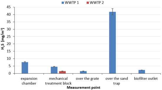 An analysis of data for two wastewater treatment plants operating with MBBR (Moving Bed Biofilm Reactor) technology, the first with a throughput of 1200 m3/d (WWTP 1), the second with a throughput of 2800 m3/d (detailed characteristics of this wastewater treatment plant in []) (WWTP 2), provided by one of the Water and Wastewater Management Plants in the Subcarpathian Voivodeship (Poland), made it possible to identify the concentrations of selected malodorous substances, i.e., hydrogen sulphide (measurement of H2S using a Keison infrared gas analyser type Geotech GA 2000; detection rate 0–500 ppm; measurement error ± 10%), ammonia (measurement of NH3 using a multi-parameter portable gas analyser from OMC ENVAG type Gasmet DX-4000; detection rate < 1 ppm, measurement error < 2%) and volatile organic compounds (measurement of VOCs using a portable volatile organic compound analyser from J.U.M. model OVF-3000 J.U.M) at various locations in the treatment plant. Measurements at the treatment plants were conducted in windless weather and at an air temperature of 21 °C. In the case of WWTP 1, the highest concentration of hydrogen sulphide was found above the grit chamber, which is a self-contained open facility (41.86 mg/m3), but facilities such as the expansion chamber (facility closed) and the mechanical treatment block (closed technological hall) were also characterised by high emissions of this odorous substance of 7.61 mg/m3 and 4.57 mg/m3, respectively (Figure 9). In contrast, for WWTP 2, the mechanical treatment block (closed technological hall) was the single point from which hydrogen sulphide release took place (1.52 mg/m3). It should be noted that in the case of WWTP 2, mechanical treatment is carried out using an interlocked Huber Rotamat Ro5-HD unit, which is a fully enclosed unit and is a combination of a screen and grit chamber. In both WWTPs, air drawn from the expansion chamber, and from above the open grit chamber in the case of WWTP 1 and from the closed screen-grit chamber in the case of WWTP 2, is directed to the biofilter. In both treatment plants, hydrogen sulphide concentrations were not recorded in the biological wastewater treatment section (MBBR reactors) and in the sludge treatment section (sludge lagoon). According to the data in Table 1, the measured values at some points exceed the maximum permissible concentration (7 mg/m3). It is worth noting that the reference value for hydrogen sulphide in the air (averaged over a 1 h period), in accordance with the Regulation of the Minister of the Environment of 26 January 2010 on reference values for certain substances in the air, was set at 0.02 mg/m3.
