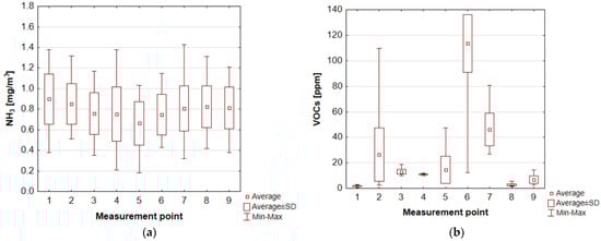 Concentration values at different measurement points of WWTP 1: for (a) ammonia; (b) volatile organic compounds (own elaboration based on []). 1—entrance to the wastewater treatment plant, 2—expansion chamber, 3—mechanical treatment block, 4—measurement directly over the screen, 5—measurement directly over the grit chamber, 6—outlet from the biofilter, 7—biological treatment block, 8—sludge lagoon 1 (aeration off), 9—sludge lagoon 2 (aeration on).