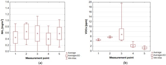 Concentration values at different measurement points of WWTP 2: for (a) ammonia; (b) volatile organic compounds (own elaboration based on []). 1—entrance to the wastewater treatment plant, 2—mechanical treatment block, 3—biological treatment block, 4—sludge lagoon (aeration on), 5—container with screenings.