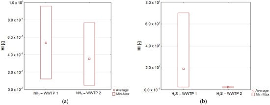 Ranges of hazard index (HI) parameter determined for ammonia (a) and hydrogen sulphide (b) (HI values were determined by the method proposed by [], assuming that daily exposure time is 6 h/day, exposure frequency is 350 days/year, exposure duration is 35 years, average time is 25 years for non-carcinogenic risks. According to [], the reference concentration for NH3 and H2S was assumed 5.0 × 10−1 mg/m3 and 2.0 × 10−3 mg/m3, respectively).