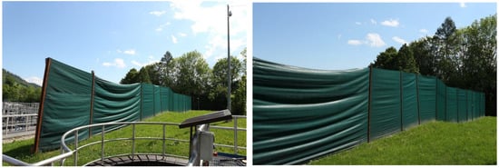 In the case of surface emitters at wastewater treatment plants, or where there is no possibility of capturing polluted air, three methods of dealing with odour nuisance can be distinguished. The first is masking—which involves replacing a nuisance odour with a more pleasant odour []. The second method is fogging, which involves the use of compounds that exhibit neutralising properties. These include aldehydes and ketones []. However, studies have shown that the use of masking and neutralising agents, despite the reduction of odour nuisance (hedonically), can increase the odour concentration of emissions even above permissible values []. The third method is the use of shield mats, which are spread around the surface emitter. The use of a barrier about 2–2.5 m high made of a cover fabric (cover mat) of at least 300 g/m2 guarantees effective protection against strong wind gusts and, consequently, against the spread of malodorous gases and bioaerosols. Figure 13 shows an example of a shield fabric barrier at a wastewater treatment plant in Zakopane (Poland).