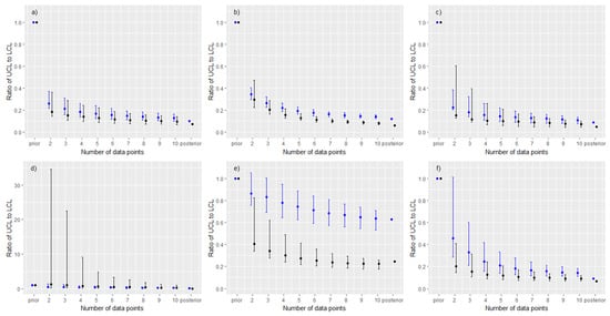 A comparison of the ratio of UCL to LCL (blue denotes results for GM, black denotes results for 90th percentile of exposures) against sample size. Solid points correspond to the 500th value from an ordered series of simulation output at each sample size; interval corresponds to 50th and 950th values. All results normalised relative to ratio of UCL to LCL under the prior. Panel labels (a–f) correspond to case study labels.