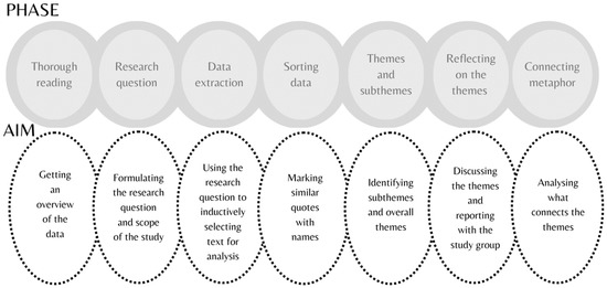 The data analysis, conducted by the first author, began with a thorough reading of the interviews. The aim of the first phase of the data analysis was to gain an overview of the interviews’ contents. Then the authors worked together on formulating the research question and the scope of the study. Next, NVivo (QSR) was used to extract data and select text for the purpose of answering the research questions. After that, the data was sorted by selecting quotes reflecting the women’s methods of survival following their experience with IPV. The themes were then further analysed into main themes and subthemes and sorted. In our study, each theme contained an essence, an underlying pattern, or a core concept uniting the women’s experiences [29]. The themes could also contain contrasting or ambiguous perspectives. Next, the themes were subsequently specified, and descriptive chapters about the main themes were written, where the themes were discussed, reflected upon, and verified by the research group. By using original extracts from as many participants as possible, we aimed to help the reader see the connection between the results and the original data. Finally, we analysed the connections between the themes and identified the metaphor that reflected the interconnection of the themes, binding them all together. The phases and aims of the phases of the data analysis are shown in Figure 1.