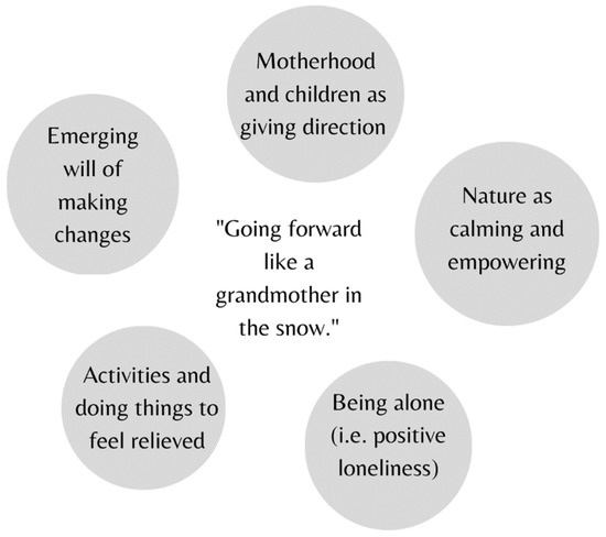 The women used a Finnish metaphor referring to grandmothers, which can be interpreted as a form of support and as a description of their relationships with the older generation of mothers. The metaphor is set in nature, specifically in the wintry landscape, where movement may be slowed down. Moving forward in the snow is no doubt possible, but only if one is prepared for the circumstances of the environment. In the metaphor, a grandmother moves forward by themselves, in the same way that the women in our study described being alone and finding solitude as sources of strength. The metaphor also describes action within the winter landscape. For our participants, action was needed to survive and overcome life-threatening IPV, and the women had indeed moved forward despite challenges in their lives. During such hardship, perseverance is needed because change may be slow. That reality was expressed by the mothers in our study, all of whom needed all of their inner strength to survive IPV.