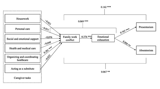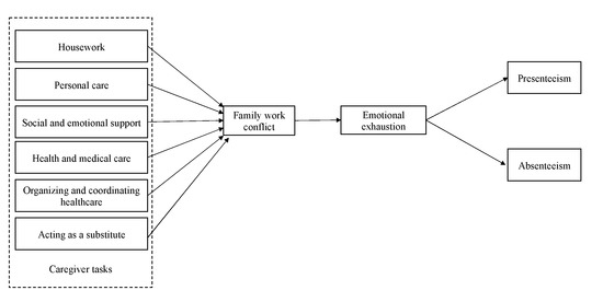 Based on the COR theory [20], the present paper aimed to understand the mechanisms and antecedents of presenteeism and absenteeism among informal caregivers’ tasks through family–work conflict and emotional exhaustion. This study sought out which tasks among seniors’ informal caregivers were most likely to lead to presenteeism and absenteeism behaviors.