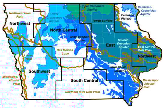 All 99 counties of Iowa were included the study area. Iowa has been divided into six hydrogeologic regions by the Iowa Department of Natural Resources: northeast, east, south-central, southwest, northwest, and north-central (Figure 1) []. Each region is distinguished based on similar soil type, landscape, and hydrogeologic characteristics, all of which have the potential to impact the susceptibility of aquifers to contamination. This classification system was applied in the 1988–1989 Iowa Statewide Rural Well Water Survey (SWRL) analysis [].