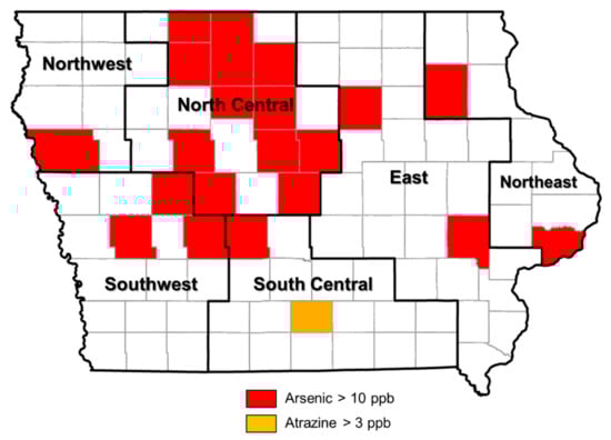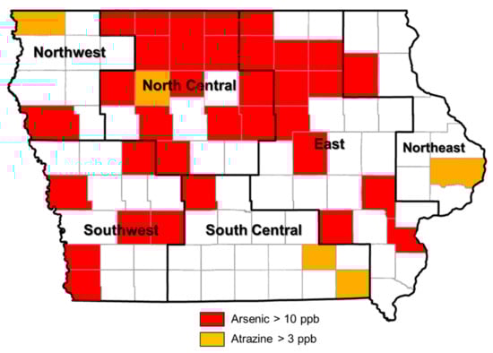 Growing public health concerns are related to human exposure to drinking water contaminants and their potential adverse effects on health. Drinking water from both surface and ground waters can become contaminated by natural and anthropogenic contaminants that accumulate in water running off the land surface or infiltrating aquifers through the soil []. Water contamination along these general pathways leads to exposure to these contaminants through human consumption of the affected water []. Arsenic and atrazine are two water contaminants of high public health concern in Iowa, as they are the most prevalent naturally occurring and anthropogenic water contaminants, respectively.