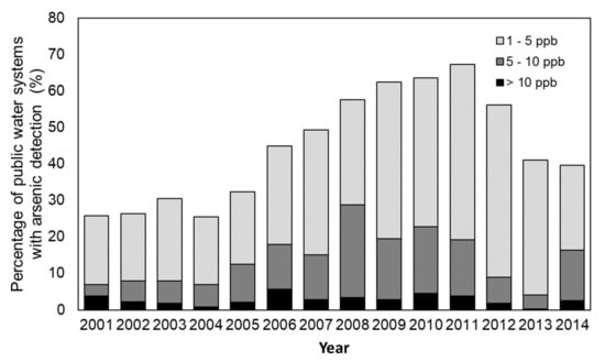 Percentage of public water systems by annual median arsenic category, 2001–2014.