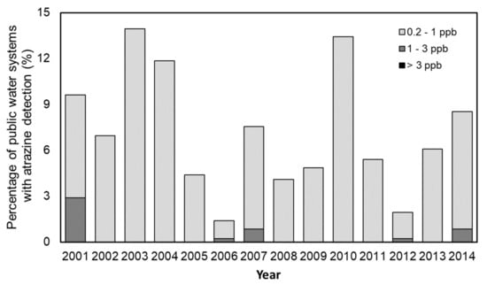 Percentage of public water systems by annual median atrazine category, 2001–2014.
