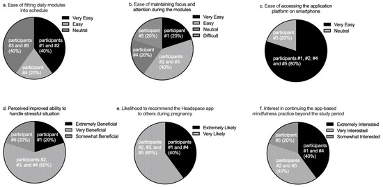 Participants’ responses regarding their experiences in participating in the study and using the Headspace app (N = 5). All questions were asked on a 5-point Likert scale as follows: (a–c) response options ranged from very difficult to very easy; (d) response options ranged from not at all beneficial to extremely beneficial; (e) response options ranged from extremely unlikely to extremely likely; (f) response options ranged from extremely uninterested to extremely interested.