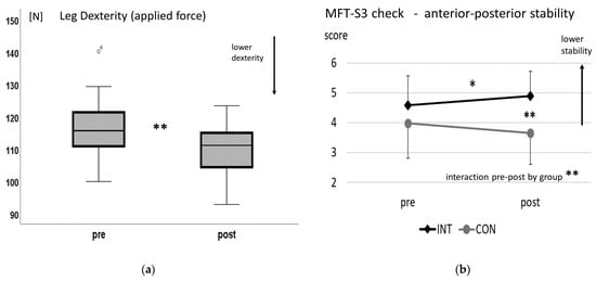 (a) Leg dexterity maximal force (boxplot) pre- and post-downhill walking (leg dexterity force in N), ** p < 0.01. (b) MFT-S3 balance test in anterior–posterior direction. Stability scores (mean and standard deviation) pre- and post-downhill walking for the intervention group (INT) and control group (CON), * p < 0.05, ** p < 0.01.