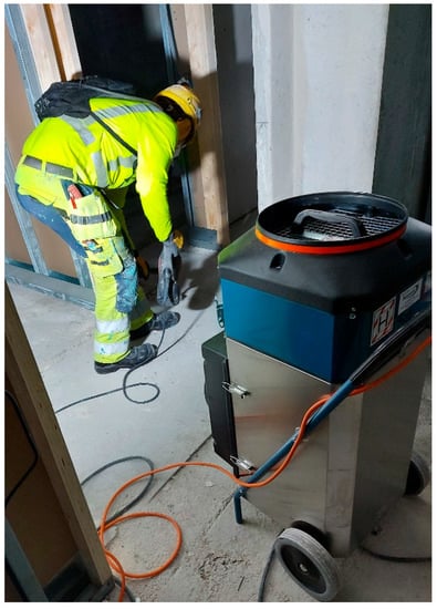 Indoor construction work is often done in poorly ventilated premises, which is why a high respirable quartz content in the general air may, in many professions, be a major source of exposure, including work tasks that do not generate quartz dust per se. According to the Finnish Government Regulation on the safety of construction work, dust must be removed via air conditioning, targeted removal, or other appropriate measures []. If necessary, the spread of dust must be prevented by shielding dusty work areas through protective walls, with the shielded area underpressurized to yield a sufficient pressure difference to inhibit the spread of dust, as well as an air exchange ratio of, at the minimum, 6 h−1 []. Compartmentalization and negative pressurization are, however, most often not possible in conventional work due to economic constraints. Hence, our partners and the representatives of the construction sites we investigated did not consider negative pressure to be a realistic option in most conventional interior work tasks. According to their estimation, it would substantially increase work and heating costs.