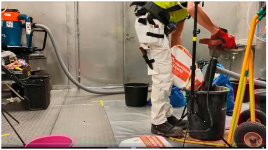 Most importantly, just as tasks potentially producing high amounts of respirable quartz dust could be carried out safely, it was also apparent that one can be exposed excessively in work tasks where dust emission is normally low by making suboptimal choices as pertains to working methods or, for instance, to the timing of the work task in relation to other work tasks with much higher dust emissions (Figure 6). Management was exposed, for example, by spending long periods of time without a respirator in departments or on floors where dusty work was done. Element installers were exposed when, for instance, performing multiple drill locations to install support bars and post-installed reinforcing bars for concrete elements without respiratory protection. The drivers of work machines could similarly be significantly exposed to respirable quartz when cabin windows are open, or by spending long periods outside the cabin when, for example, charging holes were drilled, dry crushed concrete waste was pulverized at demolition sites, or dry substrates were leveled with plate compactors, or when moving dry, dusty quartz-containing materials, such as foam glass, sand, or demolition waste. Green builders, on the other hand, could be exposed to quartz by working close to front loaders bringing dry gravel or sand, and when mixing concrete without a respirator, or when using plate compactors either to settle pavement seaming sand, or to even sand before laying pavement stones. Similarly, building cleaners were significantly exposed if they worked on premises where dusty work was done, or if they used a brush instead of a cleaning squeegee to pile up larger waste, or when emptying vacuum cleaners that did not have closable dust bags. In building cleaning, as in most other interior jobs. It was, therefore, important to consider how other jobs were paced in relation to cleaning. Further, it mattered which choices were made to control dust during the work itself. Consequently, in interior construction sites, cleaning the floor or department should be done, at the earliest, the next day after dusty work is finished (Figure 6).