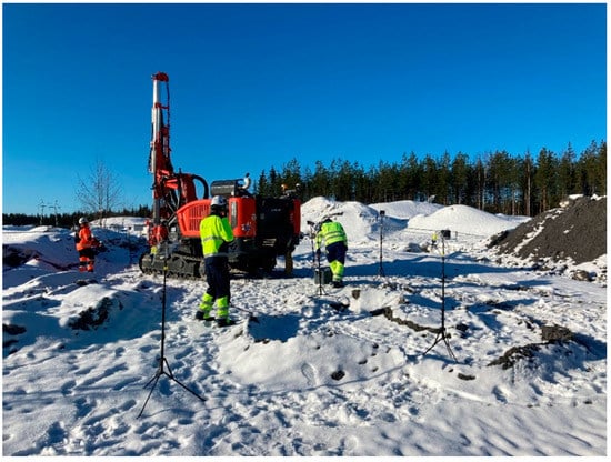 Measuring quartz dust emissions of a drilling rig in a test field. Reproduced with permission from Tuomi et al., Finnish Institute of Occupational Health, 2022 [].