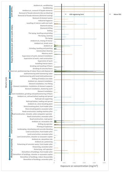 Most domestic construction companies have not estimated the quartz exposure of their workers as part of statutory risk assessment. Hence, construction employers often do not have sufficient data to assess who they should report to in the ASA register and in which tasks the statutory limit value or OEL value may be exceeded []. Furthermore, that is also why it is challenging for many, if not most, construction companies to decide whose employee’s health should be monitored by the occupational health care contractor. These are considerable practical problems in an industry where tens of thousands of workers are potentially exposed to quartz. This study addresses these needs. The starting point was to identify work tasks where respirable quartz exposure can be moderate, significant, or excessive. Furthermore, we aim to give instructions on their safe execution so that the exposure can be kept low (Table 1). To serve this end, the project also evaluated the effectiveness of various dust control measures in reducing exposure. Finally, the goal was to list tasks where occupational health care, health monitoring, and/or ASA registration come into question.