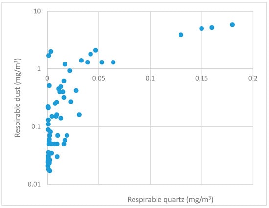 Among these workers, the 60% percentile of estimated exposures was less than 10% of the OEL, which is low and below the ASA registering limit. The 90th percentile of all estimated exposures was 0.05 mg/m3, matching the OEL, and the 95th percentile was 0.2 mg/m3, exceeding the statutory exposure limit by 100%. Estimates of work-task-specific exposure ranges were highly dependent on the adapted dust prevention measures, including ventilation, water use, and the use of tool-specific exhaust vents, as well as on the use of respirators and the duration of respirator use. In addition, the timing of work tasks with respect to the dust emission potential of simultaneously performed tasks was key in preventing exposure. On average, quartz present in the general air contributed significantly to the workers’ total exposure. Furthermore, this should be taken into account when assessing the need for using respirators outside of actively performing dusty activities. In fact, in many cases, the general air was the main source—and could also be the only source—of quartz dust exposure. Overall, in this project, respirable quartz concentrations in the general air were of a similar level to those previously reported by Antonsson and Sahlberg [], while the corresponding respirable dust concentrations were somewhat higher (Figure 8). Low general air respirable quartz concentrations (<0.005 mg/m3) were mostly measured during outdoor work and in all the break rooms we examined. However, high general air concentrations were also measured outdoors, for instance, at blasting sites and near the crusher at gravel pits, and when pulverizing demolition concrete.
