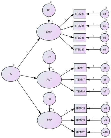 According to the theoretical model proposed for the development of this instrument, three dimensions were established. The first dimension “empowerment/motivation” includes four items, the second dimension “autonomy/situated Learning” includes three items, and the third dimension “emerging digital pedagogies” includes three items (Table 4).