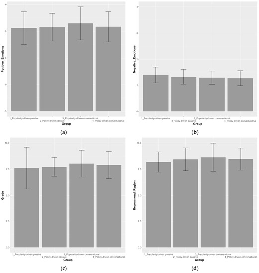 We analyzed the data in five stages. First, we described the experience and evaluation variables for the sample as a whole. Then, we examined differences on experience and evaluation between the four conditions (popularity-driven/passive, policy-driven/passive, popularity-driven/conversational, policy-driven/conversational) using conditional group means and one-way analysis of variance. The third and fourth stage of data analysis aimed to assess if participants in different conditions visited different locations.