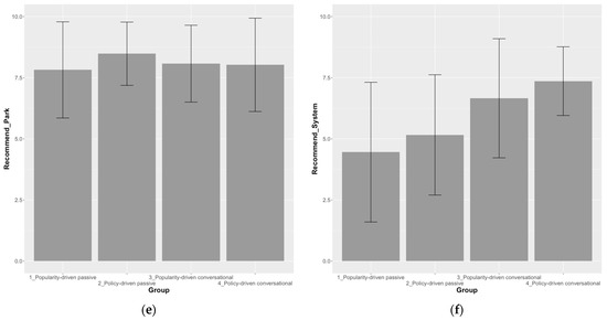 There were large differences between groups in evaluations of destination information sources. The passive app with either kind of tips earned about a 5 on an 11 point scale ranging from 0 to 10. The conversational recommender, on the other hand, earned a 6.7 (popularity-driven) to 7.3 (policy-driven) on the last day of vacation (F = 10.11, p < 0.001). Differences between tourists’ experiences aggregated by recommender system are summarized in Table 1 and Figure 2f.