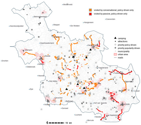 Unlike differences in reported experience and evaluations, the differences between groups in terms of where they went were clear and striking. We created maps showing locations where only one of the four groups was present (Figure 5 and Figure 6). Patterns here are difficult to discern, but there are substantial segments of provincial roads around Zwolle, Kampen, Staphorst, Tubbergen, and Enschede that were only visited by a single group. This points to different groups aiming at different attractions. Furthermore, descriptive statistics show that the different groups covered different proportions of the geographic area of Overijssel. While popularity-driven passive and policy-driven conversational groups visited about two-thirds of visited areas (and thus, 16% of the total area of Overijssel), the policy-driven passive group visited only one-third (and thus only 9% of Overijssel; Table 2). The patterns in these data show that the policy of ‘spreading’ tourists over a larger geographical area can be driven by changing attraction information from the default, but only if recommended conversationally rather than passively. The same pattern is accentuated in urban areas, where participants in the conversational policy-driven condition exhibited by far the most coverage.