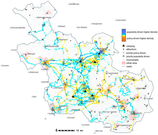 Maps of kernel density differences showed that policy-driven participants made more movements west of Ommen and in the municipalities of Rijssen-Holten and Hardenberg. Popularity-driven participants, on the other hand, moved around more just east of Ommen, just west of Almelo, and on the north side of Zwolle. (Figure 7).
