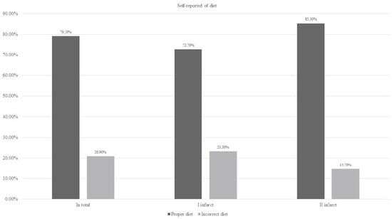 The respondents were also asked to self-report their diets. It was found that up to 53 (79.1%) patients, including 24 (72.7%) after their first MI and 29 (85.3%) after their second, as well as 22 (78.6%) women and 31 (79.5%) men considered their diets to be appropriate despite making multiple inappropriate dietary choices (