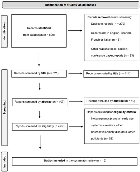 The present systematic review followed the preferred reporting items for systematic reviews and meta-analysis (PRISMA) updated guidelines from 2020 [36]. The focus of the review is to analyse those studies investigating the association between air pollutant prenatal exposure (PM, NO2, SO2, O3, CO and PAH) and ADHD in children. For this purpose, we included studies in relation to the objective of the study from the last 10 years (2012–2022). We excluded studies investigating health outcomes related with neuropsychological functions or neurophysiological data in ADHD. The literature searches were conducted independently by three investigators through Google Scholar, MEDLINE (through PubMed), Scopus and Web of Science since September 2022. The following word/search strategy was used: (“air pollution” OR pollut* OR “environment pollution”) AND (ADHD OR “attention deficit” OR “hyperactivity disorder” OR “hyperactivity”) AND (preg* OR pren*).