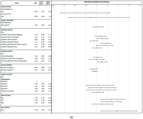 Four out of the eight studies found an association between prenatal NO2 and ADHD onset. Shih et al. (2020) [62] found that NOx was related to hyperactivity symptoms, but further analysis suggested a stronger relation between ADHD and NO than with NO2 adjusted odd ratios (aOR) [NO: aOR = 1.26, 95% CI (1.09–1.46)]. Yorifuji et al. (2016, 2017) [55,56] also found NO2 exposure during pregnancy to be strongly correlated with ADHD symptoms, such as interrupting people [aOR = 1.02, 95% CI (0.95, 1.09)], inability to wait his/her turn during play [aOR = 1.00, 95% CI (0.87, 1.14)] or failure to pay attention when crossing the street [aOR = 1.10, 95% CI (1.02, 1.19)]. Liu et al. (2022) [65] found a significant increase in hyperactivity in children when exposed to NO2 [OR = 1.04, 95% CI (1.06–1.07)] during the seventh month of pregnancy and up to four months after birth, but a peak was observed at nine months of pregnancy. However, the remaining four studies by Gong et al. (2014) [52], Fuertes et al. (2016) [54], Forns et al. (2018) [57], and Oudin et al. (2019) [59] did not find any significant or clear evidence to support the association between NOx and the risk of developing ADHD.