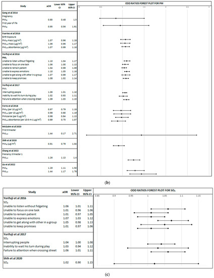 Two out of the four studies found an association between prenatal SO2 exposure and ADHD symptoms; however, an elevated exposure effect was observed at the age of 2.5 years for interrupting people [aOR = 1.04, 95% CI (1.00, 1.08)], inability to wait for his/her turn during play [aOR = 1.03, 95% CI (0.94, 1.12)], and failure to pay attention when crossing the street [aOR = 1.06, 95% CI (1.01, 1.11)] [54,55], whereas Shih et al. (2020) [62] and Liu et al. (2022) [65] did not find significant results in relation to SO2 and hyperactivity.