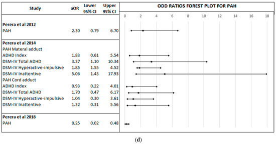 Most of the studies (four out of five) found a significant association between PAH and ADHD. The study from Peterson et al. (2022) [63] was the only one indicating no association. Perera et al. (2012, 2014) [51,53] supported that high prenatal PAH exposure was positively associated with emotional and attention symptoms. Perera et al. (2014) [53] also found a significant association of this pollutant with the following CPRS-R subscales: DSM-IV Inattentive [OR = 5.06, 95% (CI 1.43, 17.93)] and DSM-IV ADHD Total [OR = 3.37, 95% CI (1.10, 10.34)]. Furthermore, they found that children with high prenatal PAH exposure developed more ADHD symptoms than those with low prenatal PAH exposure [58]. A similar association was found by Pagliaccio et al. (2020) [60], who also described a stronger positive association between being exposed to prenatal PAH and attention problems on the CBCL subscale.
