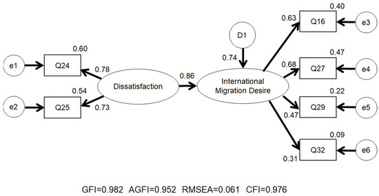 All path coefficients were significant at the 0.1% level, and the standardized coefficient for the latent variable (from dissatisfaction to international migration desire) was 0.86, indicating that it has a substantial impact. Thus, the authors conclude that the result of the SEM verified the hypothesis that a dissatisfaction with family and community obligations and economic motives influence the intention to migrate abroad.