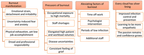 The study participants comprised six doctors and four nurses involved in caring for COVID-19-positive patients during the pandemic, with the ages ranging from 26 to 46 years and the majority (70%) being females. These participants were recruited from their original departments of work, including family medicine (three), internal medicine (three), gynecology (one), labor ward (one), general surgery (one) and high care (one). Eight and two participants were single and married, respectively. By designation, among the nurses, three were professional nurses and one was an enrolled nursing assistant compared to five medical officers and one family medicine registrar. The duration of working with confirmed COVID-19 patients ranged from 1 month to 24 months. Notably, the results of this study are analyzed without any emphasis on the specificities of the professionals interviewed (doctors vs. nurses). During data analysis, four main themes and sixteen sub-themes emerged from the analysis. These themes were burnout manifestation, precursors of burnout, alleviating factors of burnout, and lastly, every cloud has a silver lining (Figure 1).