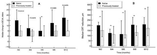 Regarding CRT, there was a significant reduction at month 12 in the difference from baseline in naive and previously treated eyes (p < 0.0001, each, respectively), which is consistent with previous published studies [,,,].