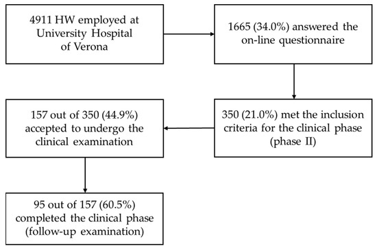 The research was addressed to 4911 HW, employed in the University Hospital of Verona at enrolling time and listed in the Prevention and Protection Service register. The study included an online screening (phase I), where high-risk individuals were identified and invited to undergo a clinical evaluation associated with an educational intervention (which represented phase II).