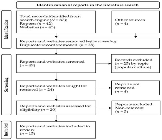Data were extracted from websites and reports about gambling, entering the following Boolean expression in the Google search engine: ((“gambling*” [Title/Abstract] OR “juego patológico*” [Title/Abstract] OR “gambling addiction” [Title/Abstract]) AND (“adicción a juego” [Title/Abstract] OR “trastornos adictivos” [Title/Abstract] OR apuestas [Title/Abstract] OR bets [Title/Abstract] OR gambling addiction [Title/Abstract] OR “ behavioural addiction” [Title/Abstract] OR “gambling use” [Title/Abstract])) NOT (drugs [Title] OR “substance” [Title] OR “substance treatment” [Title] OR “drugs treatment” [Title]).