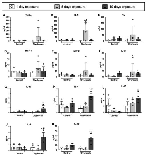 - Kumar, S.; Khodoun, M.; Kettleson, E.M.; McKnight, C.; Reponen, T.; Grinshpun, S.A.; Adhikari, A. Glyphosate-Rich Air Samples Induce IL-33, TSLP and Generate IL-13 Dependent Airway Inflammation. Toxicology 2014, 325, 42–51. [Google Scholar] [CrossRef]