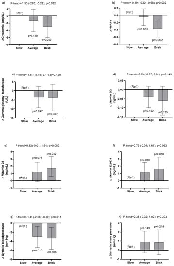 Association of walking pace with cardiometabolic health markers: glycaemia (panel (a)), HbA1c (panel (b)), gamma glutamyl transferase (panel (c)), vitamin D2 (panel (d)), vitamin D3 (panel (e)), vitamin D3 + D2 (panel (f)), systolic BP (panel (g)), and diastolic BP (panel (h)). Data presented as β-coefficient and their 95% confidence intervals (CI) by walking pace category estimated by linear regression analysis. Slow pace was used as the reference group (Ref.). Graphs shown were obtained from adjusted Model 3.
