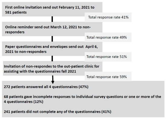 An invitation with a link to the electronic survey was distributed using patients’ digital and secure mailboxes, to which mail from Denmark’s entire healthcare is distributed. The first invitation was sent out in February 2021, and a reminder was sent out a month later. Two months later, the survey was sent out in paper format, including a return envelope for all the online non-responders. Patients who did not respond to this invitation were invited to the department to obtain assistance in completing the survey. The data collection ended in the spring of 2022.