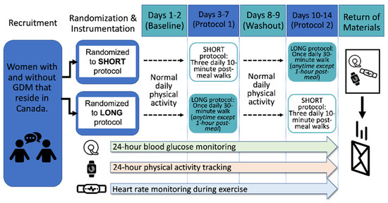 This study was a randomized, cross-over study design that compared two different exercise prescriptions for pregnant individuals with and without GDM. The participants were randomized to start with one of two study conditions using a randomization scheme (www.sealedenvelope.com, accessed on 7 March 2023) that was followed by the complementary condition. The randomization was completed by a researcher external to the investigative team, and assignments were sequentially provided when each participant consented. This study was conducted in accordance with the Declaration of Helsinki, was approved by the Ethics Committee at the University of Alberta (University of Alberta ethics protocol Pro00097525), and is registered as a clinical trial at ClinicalTrials.gov, accessed on 7 March 2023 (Registration: NCT05256615).