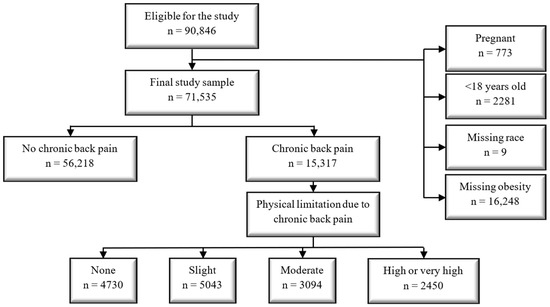 Of the 90,846 individual interviews included in the PNS, pregnant women at the time of the survey (n = 773), individuals less than 18 years old (n = 2281), and those with missing variable values for race (n = 9) and for obesity (n = 16,248) were excluded. Pregnant women were excluded from the current analyses as depression is a known psychiatric disorder that may occur due to the pregnancy state [28,29,30], which is not the topic of the current study. Therefore, the final sample size used for the current study was 71,535 (Figure 1).