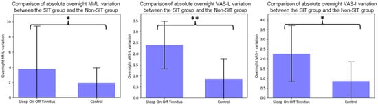 Moreover, according to our expectations, overnight absolute variations of tinnitus level, measured by MML and VAS-L and VAS-I scales, were all significantly higher in the SIT group compared to the matched sleep-stable tinnitus Non-SIT group (p < 0.05 for MML and VAS-I, p < 0.01 for VAS-L), as highlighted in Figure 1.