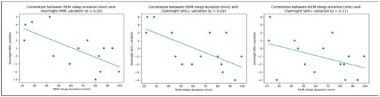 An important was observed variability in almost all sleep characteristics. While testing for correlations between sleep characteristics and overnight VAS-L variation, overnight VAS-L variation displayed a significative correlation with REM sleep percentage of total sleep time (anticorrelation, p < 0.05, illustrated in Figure A1) and with a percentage of snoring (correlation, p < 0.05).