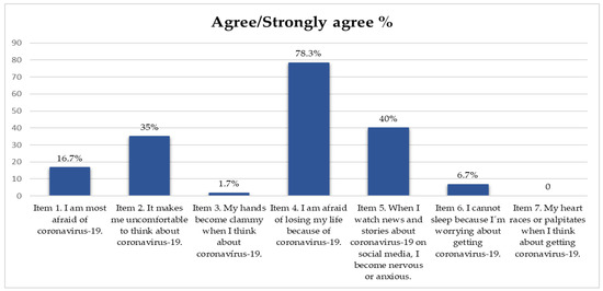 | Fear of COVID-19 (FCV-19S) | 17.38 ± 4.80 [7,8,9,10,11,12,13,14,15,16,17,18,19,20,21,22,23,24,25,26,27,28,29,30,31,32,33,34,35] | |