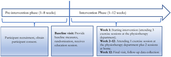 Participants engaged in a structured 12-week PA program in addition to their usual diabetes care. In total, participants engaged in 36 exercise sessions, involving three sessions per week with no more than two days without exercise. With each session lasting 45 min, participants performed three minutes of stretching exercise, 10 min of resistance training using a resistance band, 30 min of walking (brisk pace, 5.2–5.6 km/h), and 2 min of cool-down exercises. Participants attended a weekly individual session at the physiotherapy department of the KBTH, under the supervision of a physical therapist (PT). All other sessions were self-delivered at home. Participants attended a 45-min group exercise education session prior to exercise sessions. The PT gave advice on the PA program, including its importance in controlling diabetes. Participants maintained an exercise diary and a PT followed individuals on a weekly basis to encourage and document exercise participation. All participants in the IG received a brochure, a resistance band, and videos that displayed the prescribed exercise. Figure 1 shows a timeline of the intervention program.