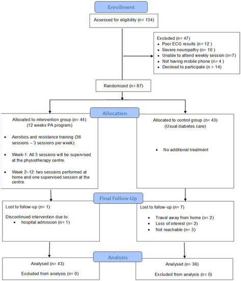 A total of 87 out of 134 patients screened for eligibility were included in the study, indicating a recruitment rate of 64.9%. Reasons for exclusion included poor ECG results (n = 12), severe neuropathy (n = 10), unable to travel to the hospital for weekly exercise session (n = 7), not having a mobile phone (n = 4), and declined to participate (n = 14). Some individuals had multiple exclusion criteria.
