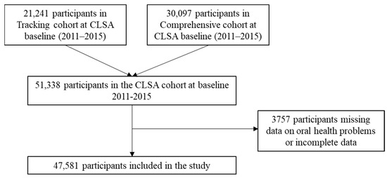 - Bassim, C.W.; MacEntee, M.I.; Nazmul, S.; Bedard, C.; Liu, S.; Ma, J.; Griffith, L.E.; Raina, P. Self-Reported Oral Health at Baseline of the Canadian Longitudinal Study on Aging. Community Dent. Oral Epidemiol. 2020, 48, 72–80. [Google Scholar] [CrossRef] [PubMed]