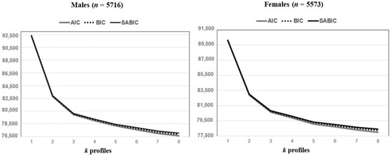 Table 2 displays fit indices of the LPA solutions separately for gender. The analysis of the information criteria [43,44] in both gender subgroups (Figure 2) indicated that the 3-profile LPA was the best solution (Figure 3).