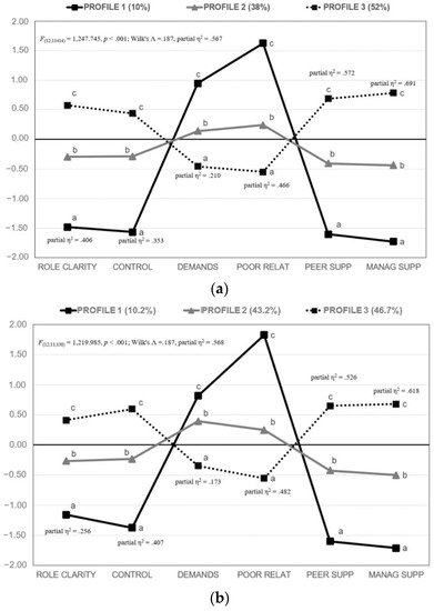 Profile 2 (38% of the men subgroup, 43.2% of the women subgroup, 40.5% of the total sample) was interpreted as normative, with medium levels in all dimensions. Profile 3 (52% of the men subgroup, 46.7% of the women subgroup, and 49.4% of the total sample) was interpreted as the virtuous profile, showing the highest perceived levels of role clarity, control, peer and management support, and the lowest perceived levels of demands and poor relationships. Profile 1 (10% of the men subgroup, 10.1% of the women subgroup, 10.1% of the total sample) mirrored the previous group, and it was interpreted as the at-risk profile. Employees in this profile showed the lowest perceived levels of role clarity, control, peer and management support, and the highest perceived levels of demands and poor relationships.